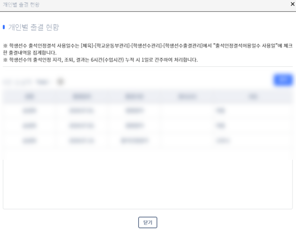 일반 출결 밑에 학생선수 출석인절결석현황표가 따로 나옵니다.