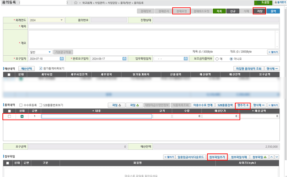 오늘은 내가 필요한 물품구입 or 강사비 지출품의 등