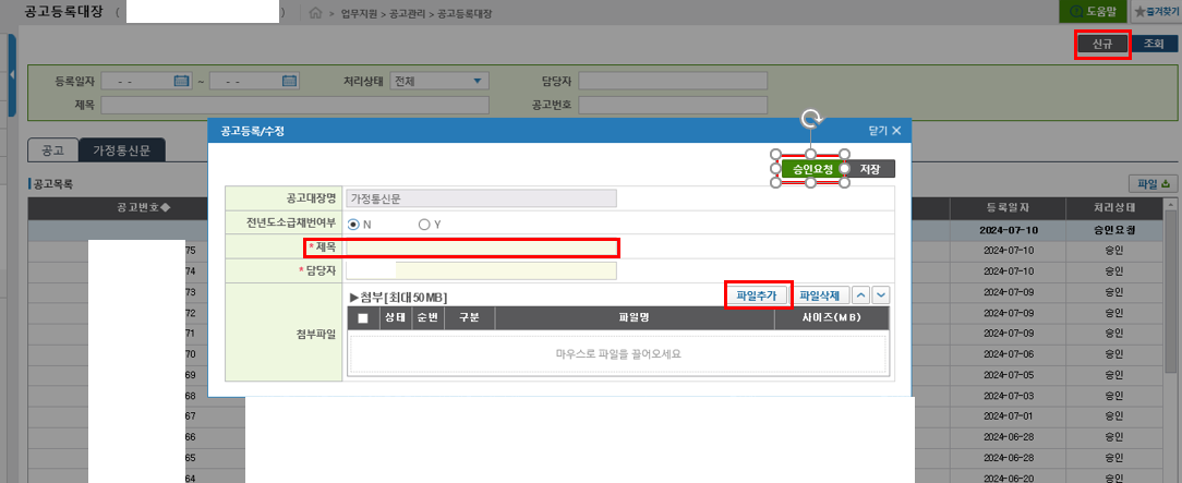 2. 가정통신문 탭에서 신규버튼을 눌러주시면 새창이 뜹니다.