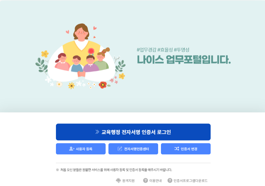 신규임용되신분들은 인증서 신청 후 사용자등록부터 시작하셔야하고, 기존사용자분들은 로그인 후