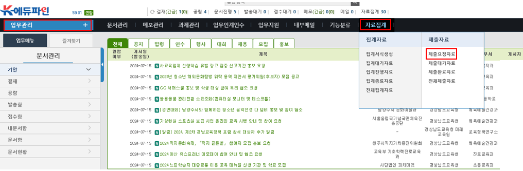 업무관리→ 자료집계 → 제출요청자료를 클릭해주세요.