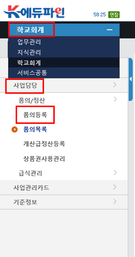 1. k-에듀파인에서 업무관리클릭 후 학교회계로 변경→ 사업담당 → 품의등록