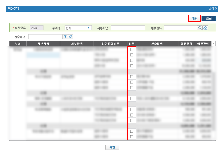 3. 예산권한 중 내가 사용하고자하는 목적에 맞는 예산을 체크하여 확인버튼을 눌러주세요.