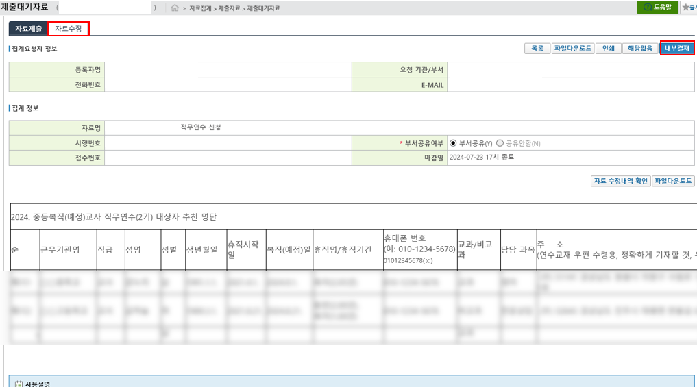 이단계에서 수정할 부분이 있다면 내부결재를 올리지마시고 자료수정을 클릭하셔서 수정 후 내부결재를 하시면 됩니다.